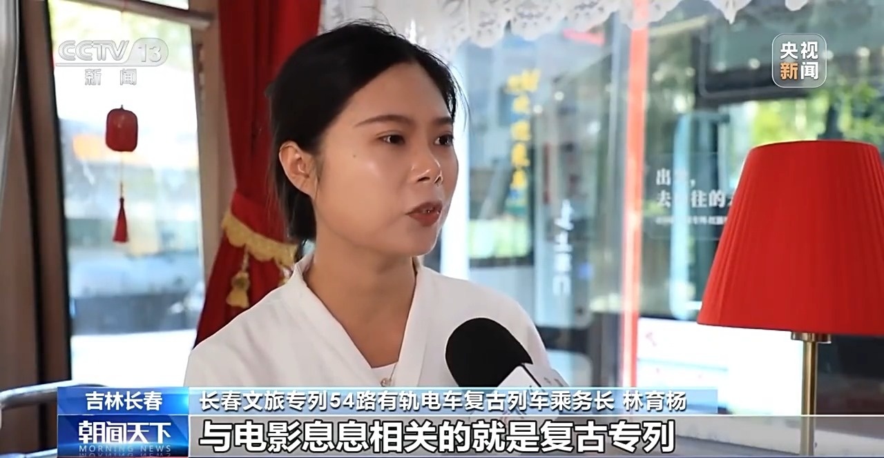 長春文旅專列54路有軌電車復古列車乘務長 林育楊:與電影息息相關(guān)的就是復古專列。它的起始站就是長影舊址博物館,途經(jīng)東風大街、創(chuàng)業(yè)大街、南陽路,都是熱播劇的取景地。