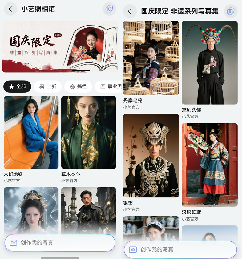 另外,對(duì)于想拍文化感滿滿的國(guó)風(fēng)影像的用戶,小藝照相館Agent上線了國(guó)慶限定非遺系列模板,進(jìn)入小藝App>右下角發(fā)現(xiàn)>智能體>小藝照相館后,在國(guó)慶限定專區(qū)選擇喜歡的模板,然后就可按步驟生成高質(zhì)量的國(guó)風(fēng)寫(xiě)真,打造專屬非遺系列寫(xiě)真紀(jì)念冊(cè)。