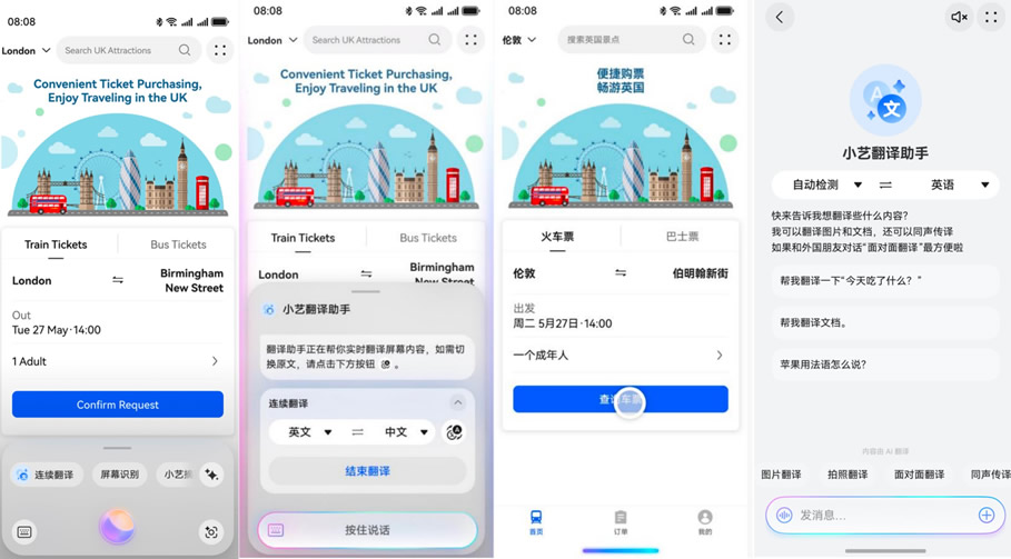 當(dāng)然,小藝的能力遠(yuǎn)不止于此。海外出行時(shí),用戶翻閱外文網(wǎng)站或使用外文App,只需長(zhǎng)按屏幕底部小藝導(dǎo)航條,點(diǎn)擊“連續(xù)翻譯”,或直接喚醒小藝后說(shuō)“連續(xù)翻譯”,即可體驗(yàn)邊瀏覽邊翻譯的效果。當(dāng)需要與外國(guó)友人進(jìn)行面對(duì)面溝通時(shí),使用小藝的面對(duì)面翻譯幫你輕松應(yīng)對(duì)跨語(yǔ)言溝通場(chǎng)景;遇見(jiàn)不認(rèn)識(shí)的外文路牌、菜單,拍照發(fā)給小藝翻譯助手秒翻譯。