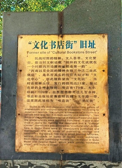 位于桂林市中心的解放西街,一座“文化書店街”舊址紀念碑在街角靜靜矗立?箲(zhàn)時期,這條街道曾有過另一個名字:桂西路。