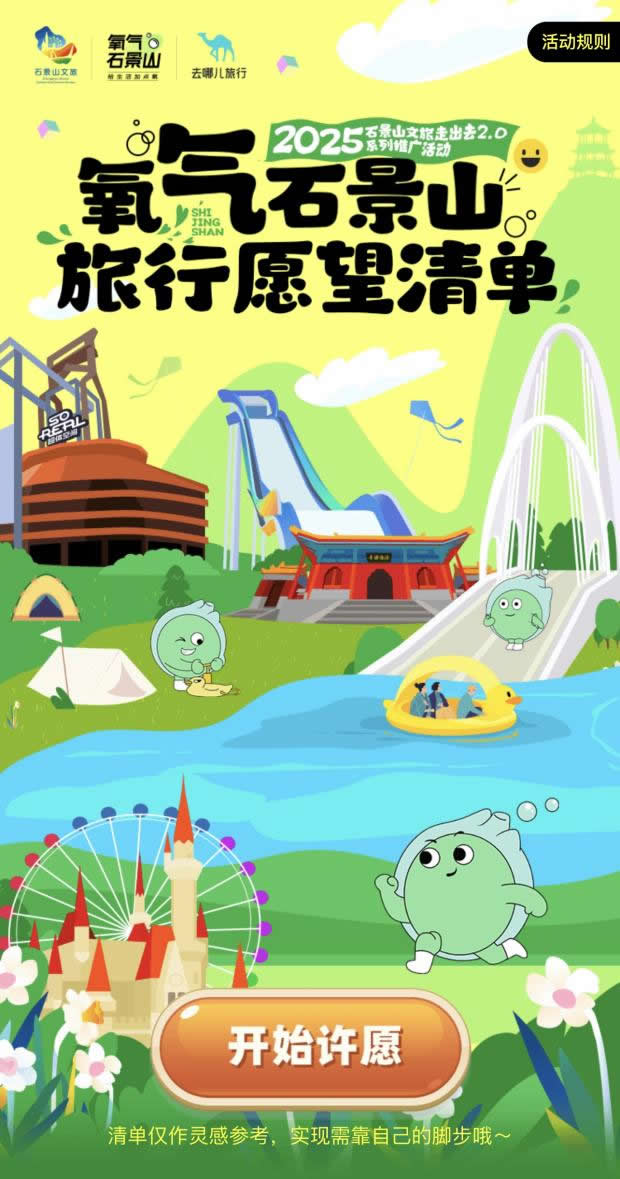 在“去哪兒”旅行APP上線“氧氣石景山”文旅專題頁(yè),不僅整合酒店榜單、景區(qū)門(mén)票、優(yōu)質(zhì)攻略等核心文旅資源,更特別設(shè)置石景山區(qū)對(duì)口支援和協(xié)作地文旅產(chǎn)品版塊,實(shí)現(xiàn)“石景山推廣+支援地區(qū)助銷(xiāo)”雙重價(jià)值。同步推出的“旅行打卡愿望清單”H5,線上用戶可點(diǎn)亮自己的石景山旅游心愿,生成專屬旅行愿望清單;在高校路演活動(dòng)中,大學(xué)生可分享H5到社交媒體作為參與活動(dòng)的入場(chǎng)券——既為高;顒(dòng)預(yù)熱,更成為高校路演入場(chǎng)憑證,串聯(lián)起“線上互動(dòng)-線下參與”的閉環(huán)。