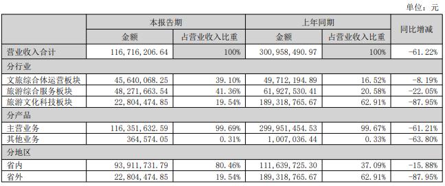 財(cái)報(bào)顯示,最近幾年,公司文旅科技板塊的營(yíng)收占比均在50%以上,是公司的主要驅(qū)動(dòng)力,然而今年上半年,公司文旅科技板塊營(yíng)收僅有2280.45萬(wàn)元,占比19.54%,縮水嚴(yán)重。