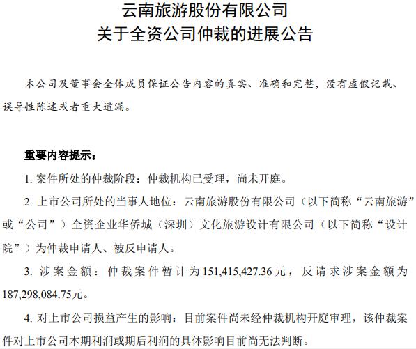 公司在今年2月發(fā)布公告,海力控股集團(tuán)有限公司與公司的全資公司云南旅游汽車有限公司所屬全資公司云南云旅交通投資開發(fā)有限公司發(fā)生合同履行糾紛,海力控股就該合同糾紛向昆明市中級(jí)人民法院提起訴訟。因云旅交投認(rèn)為海力控股存在違約,對(duì)案件提起反訴。近日,公司收到昆明中院出具的《民事判決書》,判決由云南云旅交通投資開發(fā)有限公司支付海力控股集團(tuán)有限公司工程款1.18億元及預(yù)期利息等。
