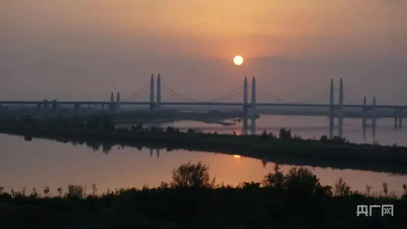 寧夏黃河濕地公園旁,黃昏時(shí)分橙紅落日西沉,橘粉色天際余暉傾灑在跨河大橋上,橋塔與拉索如巨人臂膀橫跨黃河,橋下黃河水波光粼粼與天空交相輝映,岸邊濕地植被靜默,飛鳥(niǎo)掠過(guò)蕩起漣漪,盡顯塞上江南黃昏盛景的詩(shī)意與壯美,令人沉醉。
