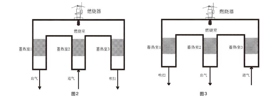 待蓄熱室3里面蓄熱體熱量吸附飽和后,切換閥進行切換,如圖2所示。廢氣進入蓄熱室3,經過高溫預熱后,進入燃燒室,從蓄熱室2出,熱量為蓄熱室2所吸收,直至蓄熱室2吸附飽和,開始切換。如圖3所示進入下一個流程,3次切換為一個,如此運行。RTO切換閥切換時間,一般為60s-120s,切