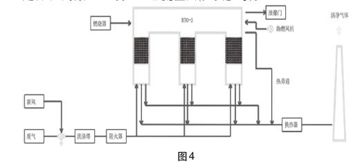 在廢氣處理項目中,3塔RTO一般與風機,噴淋塔,阻火器,煙囪等組成一個系統(tǒng)。RTO一般正壓運行,風機應選擇變頻控制適應不同工況。前置噴淋塔可吸收酸、堿性廢氣,減少對RTO爐的腐蝕。后置噴淋塔可進一步降低廢氣排放量。有的有熱回收需求,可在末端增設熱交換器,產生熱水和熱氣回用。煙囪可根據項目需要設計,一般至少為15米高,煙囪越高對廢氣擴散有利,成本也越高。系統(tǒng)的組成需要根據項目來設定,圖4為某RTO項目工藝流程圖(供參考)。