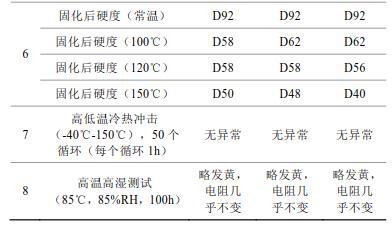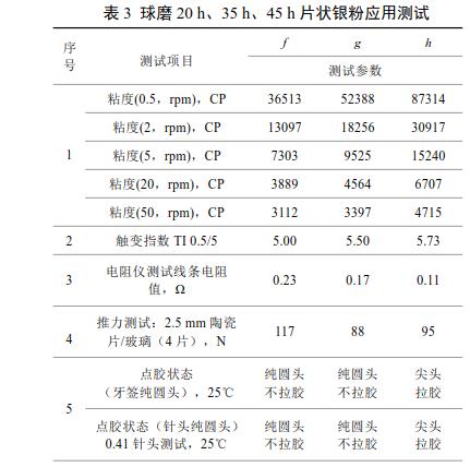 2)球磨35h制得的片狀銀粉制得的導(dǎo)電銀膠,銀膠的粘度、觸變指數(shù)、推力測試、導(dǎo)電性能、點(diǎn)膠、固化后硬度測試、高低溫冷熱沖擊測試及高溫高濕測試均滿足應(yīng)用。