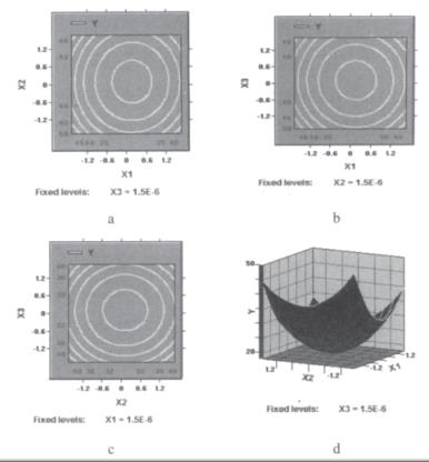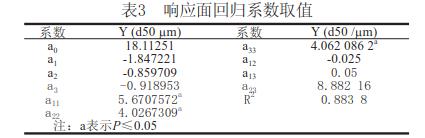 利用響應面分析法[1]化枸杞子渣超微粉碎工藝參數。在單因素預試驗基礎上,用SAS軟件系統(tǒng)進行響應面分析,設計一個三因素五水平的回歸方程來擬合因素和指標(響應值)之間的函數關系。選擇球料比(X1)、枸杞子渣漿液濃度(X2)和攪拌器轉速(X3)作為因素,以粉碎后的顆粒粒度d50作為響應值對球磨機濕法超微粉碎工藝進行化。